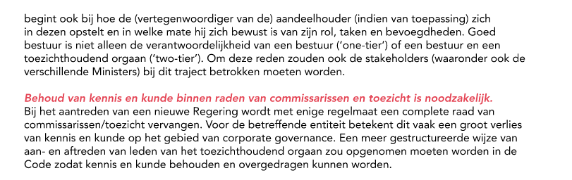 31 compania estatal a participa cu e encuesta pa haya un impresion di kico ta e estado di corporate governance actualmente. Grandemente e companianan estatal a indica cu nombramento di famia y amigo den directivanan ta crea un problema pa continuidad di conocemento riba corporate governance den e organisacion (p. 27). Nan ta bisa cu si gobierno kier impone un codigo di integridad den companianan estatal, gobierno mester ta ehemplario (p. 26-27).